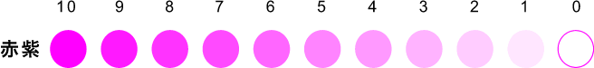 赤紫、水色、黄色、赤、青、緑、黒、白の順番に、それぞれの色を10階調のグラデーション※図1で表しました。
